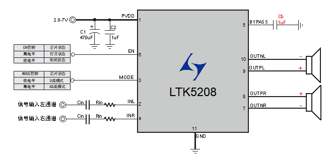 LTK5208是一款3Ω-7.9W、双声道F类音频功率放大器。LTK5208采用高耐压工艺,耐压可达7V。LTK5208具有一线脉冲功能,可控制单个管脚使功放芯片进入D类、AB类模式、关断模式,达到节省IO口的目的,如不使用一线脉冲功能,也可分别控制EN和MODE管脚, 方便地切换为各个工作模式,LTK5208在 AB类模式可以完全消除EMI干扰。在D类放大器模式下可以提供高于90%的效率,新型的无滤波器结构可以省去传统D类放大器的输低通滤波器,LTK5208独有的DRC(Dynamic range control)技术,降低了大功率输出时,由于波形切顶带来的失真,相比同类产品,动态反应更加出色。LTK5208采用ESOP-10封装。